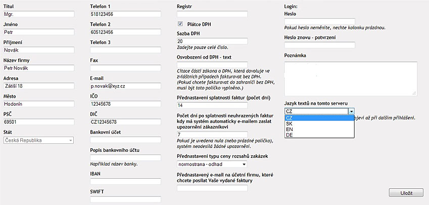 - Dalším bodem je naplnění databáze Vašimi zákazníky a údaji o nich. Můžete mít libovolný počet zákazníků, v rámci jednoho zákazníka navíc i libovolný počet různých na sobě nezávislých kontaktních osob (např. Vás z jedné firmy oslovuje víc kontaktních osob, fakturační údaje zadáváte jen u první z nich a jsou společné pro všechny ostatní kontaktní osoby v rámci dané firmy), můžete si zvolit jeden ze čtyř jazyků komunikace se zákazníkem, pro každého zákazníka si můžete nastavit různou splatnost faktur atd. Máte různé možnosti zadávání, vyhledávání, editace. Toto je asi nejdelší část na začátku Vaší práce s EasyTranslate24, ale jakmile zadáte Vašeho klienta jednou do databáze, již to víckrát dělat nemusíte, EasyTranslate24 si všechno ukládá.